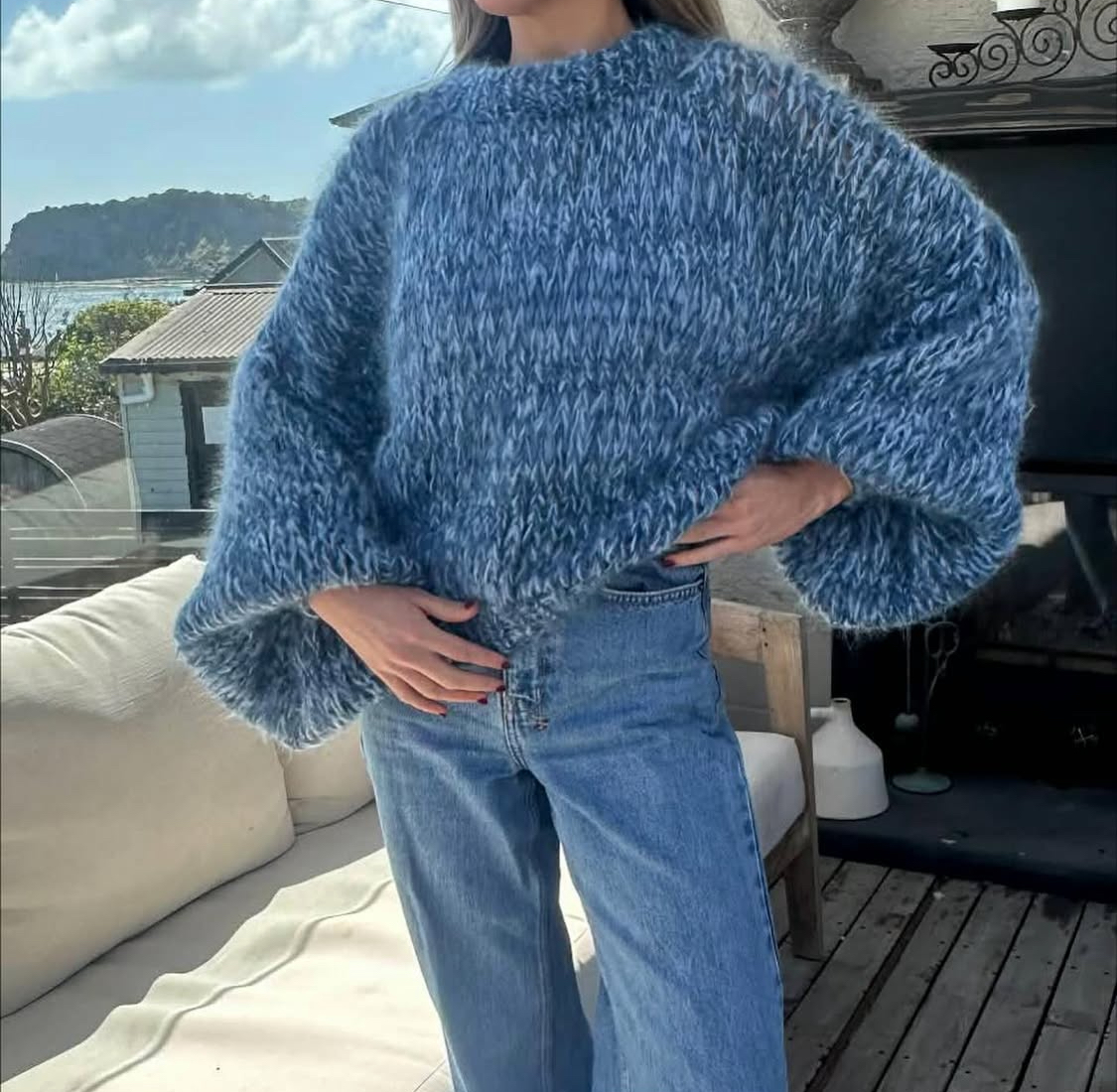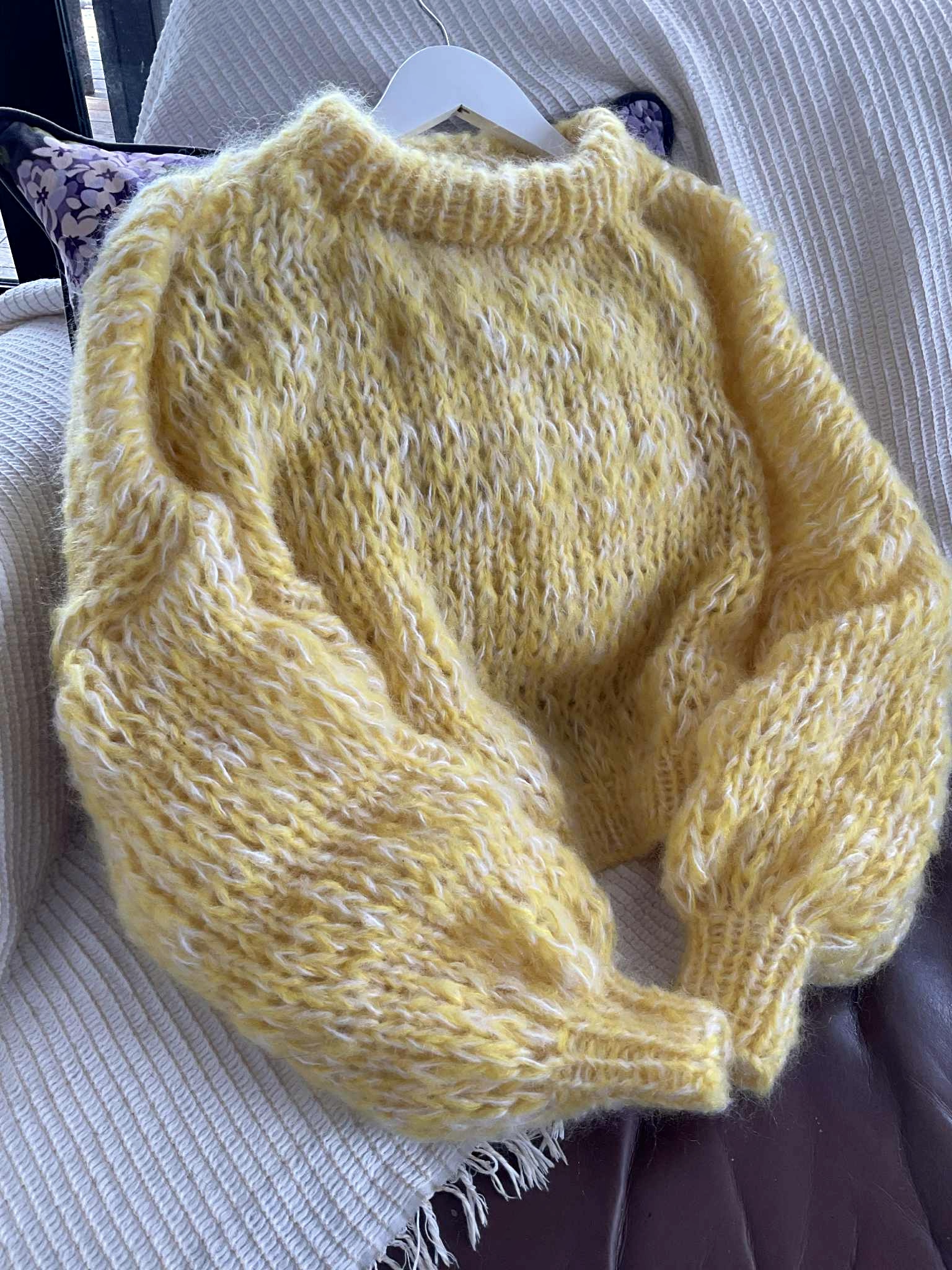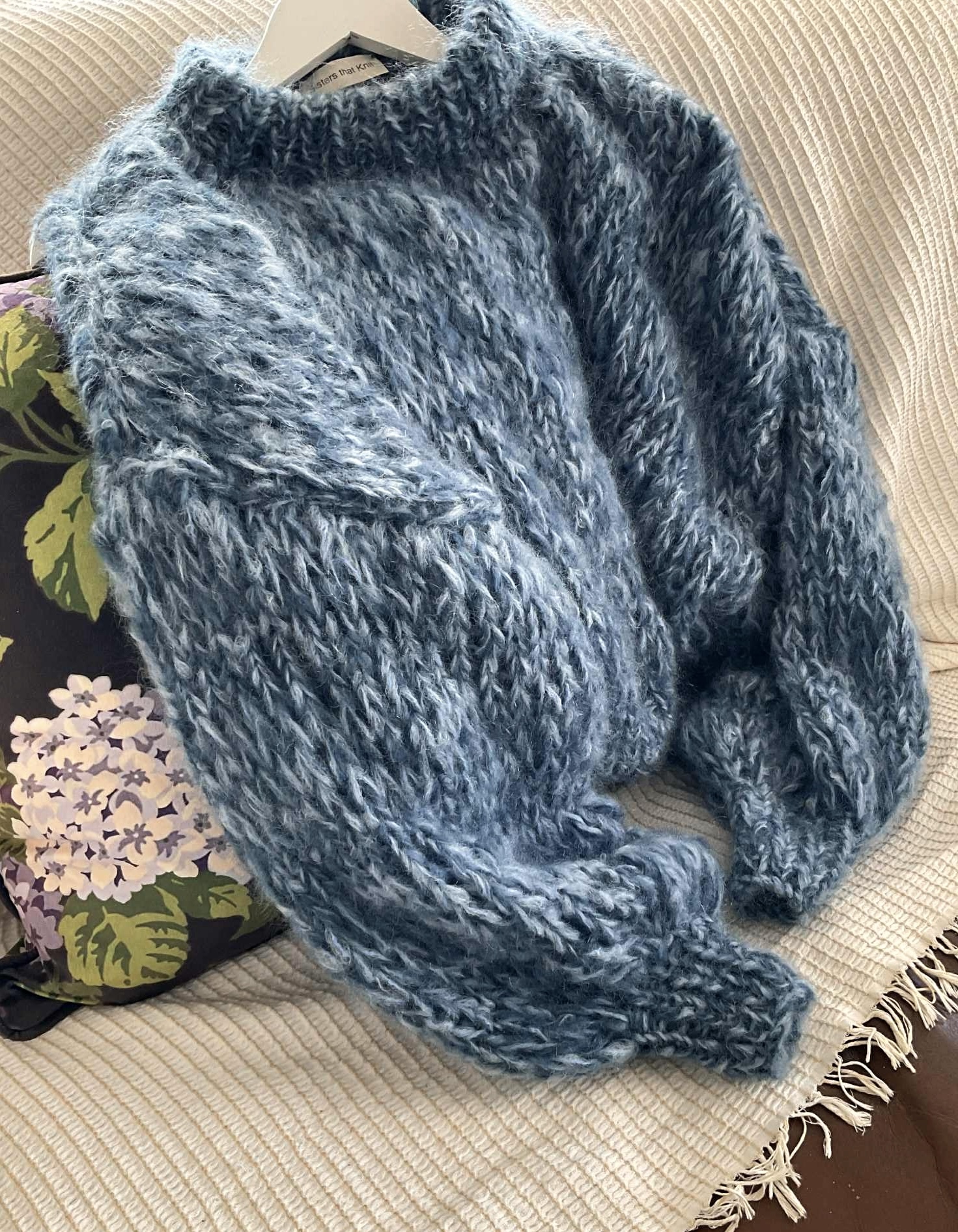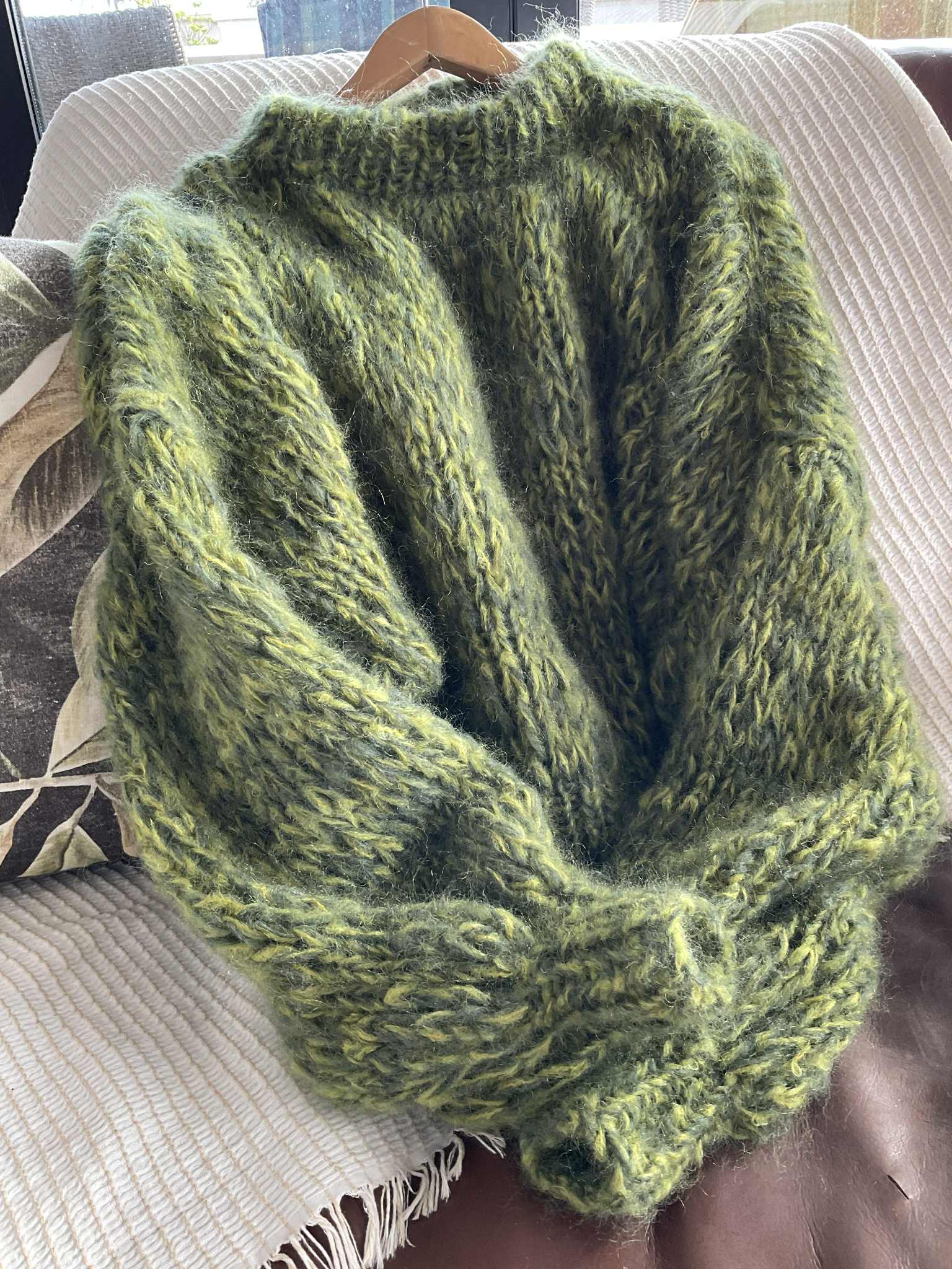 Wrap yourself in colour and comfort with this hand-knitted mohair piece — a true labour of love. Each sweater is crafted by hand, making every one unique in its blend of tones and textures. The soft mohair yarn gives it a lightweight yet luxuriously warm feel, perfect for layering across seasons.